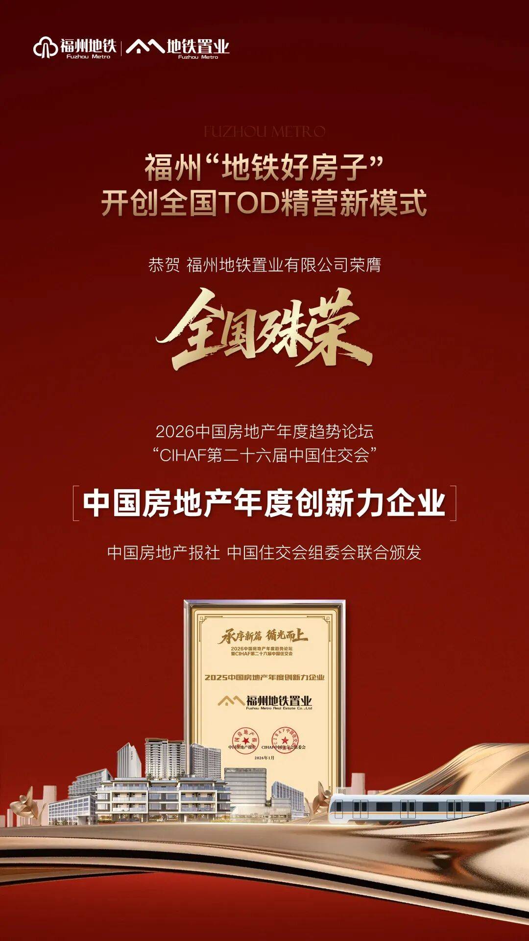 近日,由中国房地产报社、CHAF中国住交会组委会、中国城市与区域治理研究院联合主办的在北京召开,福州地铁集团全资子公司 “福州地铁置业” 荣膺【2025中国房地产年度创新力企业】称号。