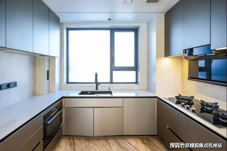 厨房为U型布局,配备博世四件套厨电,包含三眼灶、油烟机、洗碗机、蒸烤一体机,还有科勒抽拉龙头及日立厨房空调等高端品牌,中岛与飘窗休闲区相连,扩展了操作与互动场景。